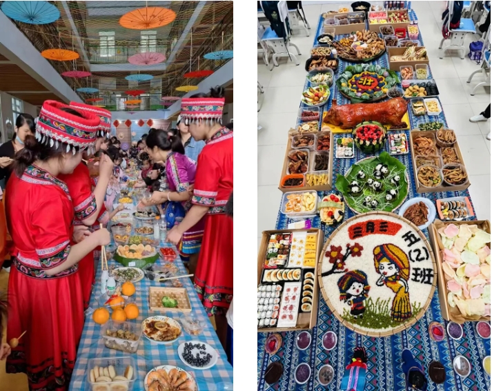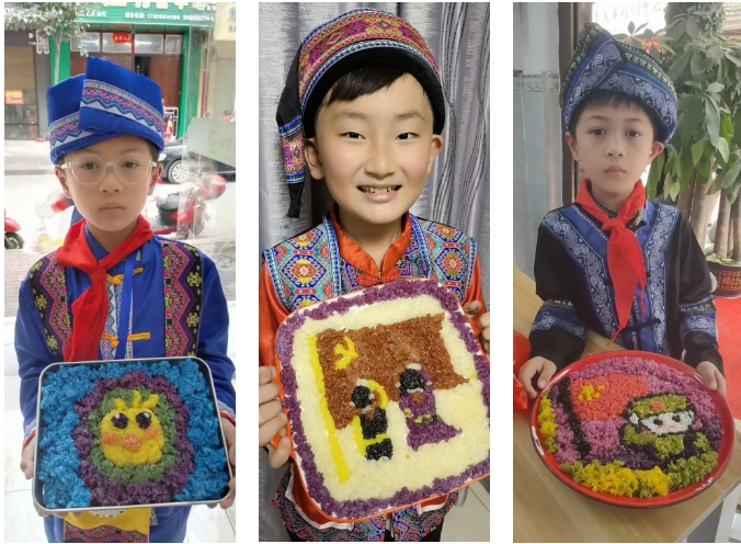 “長(zhǎng)桌宴”又稱合攏宴,是侗族、苗族、瑤族等多個(gè)民族的風(fēng)俗習(xí)慣,常用于接親嫁女、滿月酒、村寨聯(lián)誼等宴飲活動(dòng),代表最為隆重的待客禮俗,已有幾千年歷史。“長(zhǎng)桌宴”上有壯族特色的五色糯米飯、艾葉糍粑、壯粽,苗族的傳統(tǒng)佳肴,還有黎族的三色飯……一份份美食造型美觀、色彩鮮艷、香味撲鼻。圖為集團(tuán)職工拍攝的孩子參加學(xué)校“三月三”活動(dòng)。