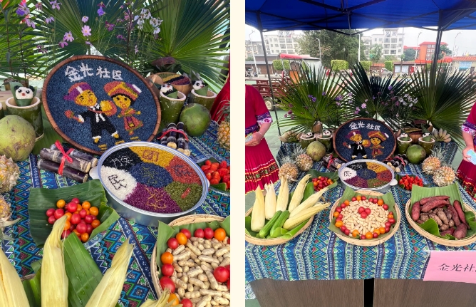 大家用簸箕拼盤將層次分明、色彩斑斕的各項(xiàng)珍饈有規(guī)律的擺放到簸箕中,從五谷雜糧的馥郁到山珍海味的鮮美,再到田園時(shí)蔬的清香,這些菜肴不僅口感獨(dú)特,而且蘊(yùn)含著豐富的民族文化內(nèi)涵,體現(xiàn)了人們對美好生活的向往和追求。圖為集團(tuán)公司職工前往社區(qū)參加活動拍攝的特色美食照片。