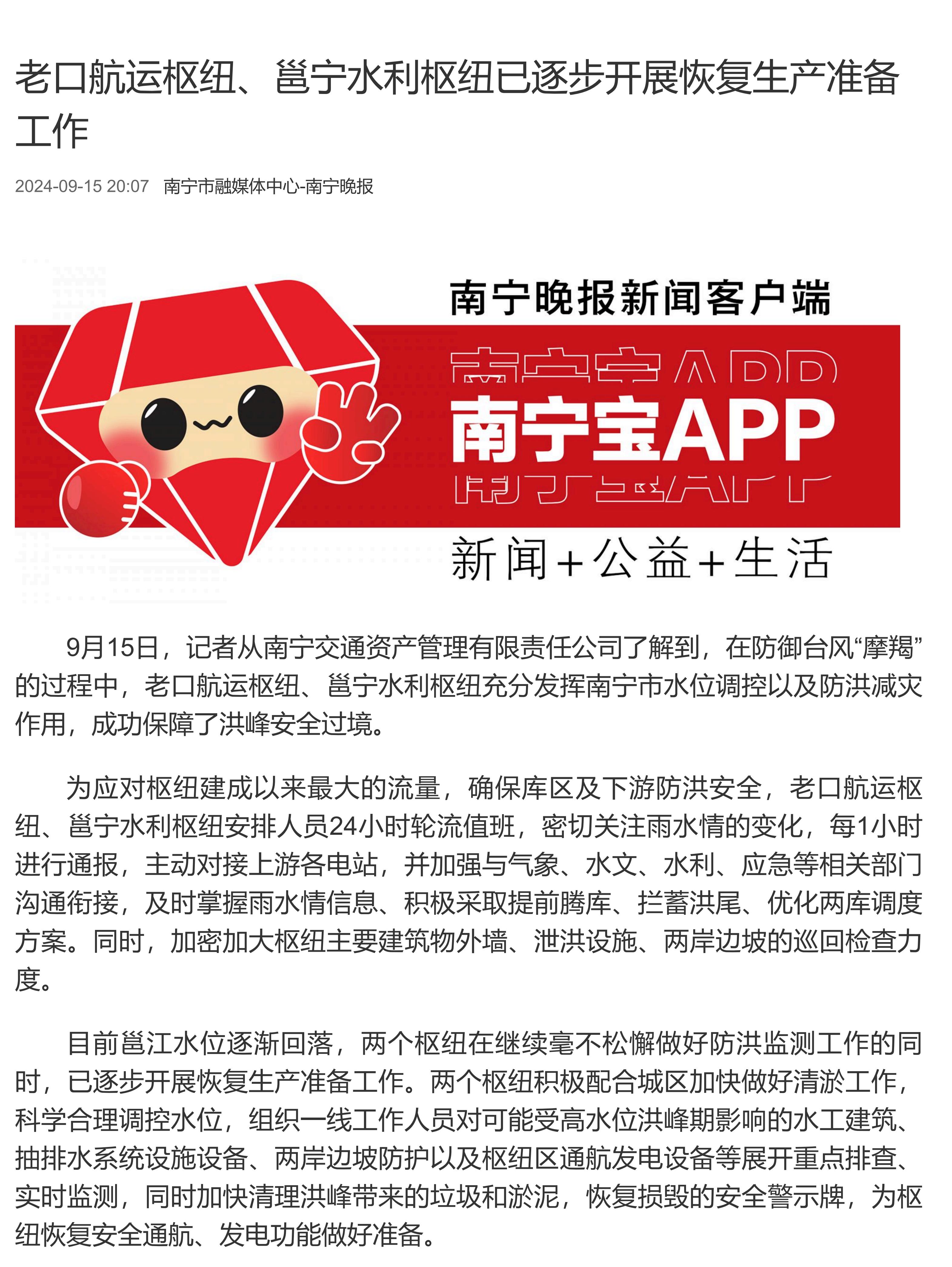 老口航運樞紐、邕寧水利樞紐已逐步開展恢復(fù)生產(chǎn)準(zhǔn)備工作